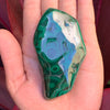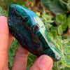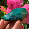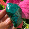 It is protective and can purify its environment; it also encourages transformation and growth. Its deep green brings emotional healing, especially to the Heart Chakra, and encourages strength, willpower, confidence, and leadership. Malachite helps keepers connect more easily to Mother Nature and Nature spirits, as well as to the wellspring of creativity and power within themselves.